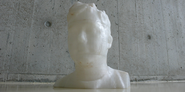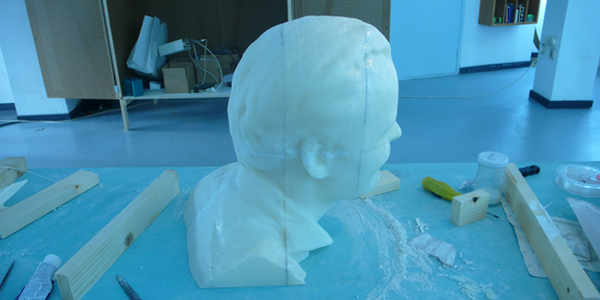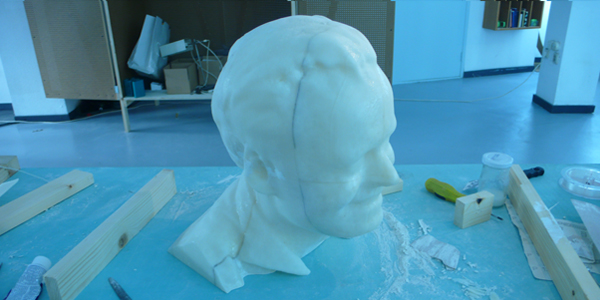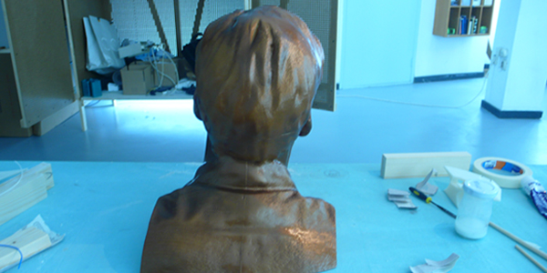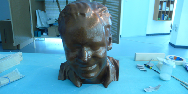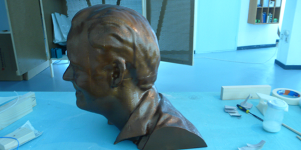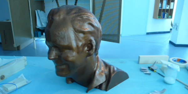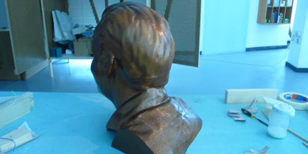 De buste is verdeeld in 14 printbare stukken. Deze hebben we met de nodige bewerkingen tot één complete buste in elkaar gezet en gespoten in een bronsachtige kleur.